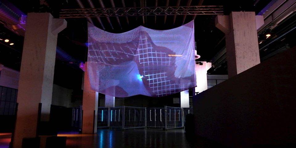 Apart from the exhibition in the factory, art will also arise at various other festival locations as well. Utrecht-based visual media artist, researcher and curator Carolien Teunisse will present her new installation ‘**Field_in_Flux**’ in the foyer of Theater aan het Spui. The work reveals invisible fields in space by means of computer vision, creating fluid morphing shapes in places where a physical cloth intersects with virtual color fields. Natural physics and algorithms join forces to create unpredictable and hypnotizing movements where chance is the only constant.
