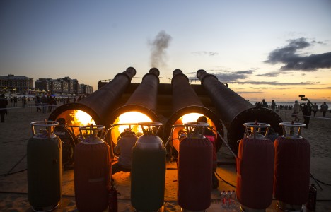 Together with TodaysArt, Staalplaat Soundsystem (for this occasion consisting of Geert-Jan Hobijn, Radboud Mens and Bastiaan Maris) created ‘Zeero’, a very large organ made of steel pipes (normally used for sand suppletion) with a length of 24 meters and a diameter of 1.2 meters. Staalplaat used gas burners used for hot air balloon to make hot air move through the pipes, which will generate a very low tone.