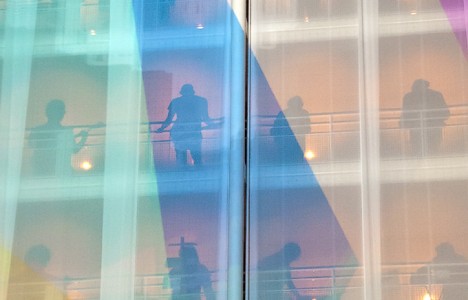 In the Atrium of the The Hague Town Hall Structet presented a monumental, architectonic vertical matrix of improvised electronic music and projections. An army of hidden musicians on laptops and custom built instruments will form an electronic orchestra that will be performing on seven floors. A ‘conductor’ behind a mixing board for both image and sound will transform the different inputs into one single piece of music and projections. Structet adapts itself to the building or spatial structure where it performs, with a preference for the vertical dimension. The structure of the improvisation is based on a study of the proportions, scale, colour, history and function of the location of the performance. This performance is based on a study of architecture of the Town Hall by Richard Meier. |