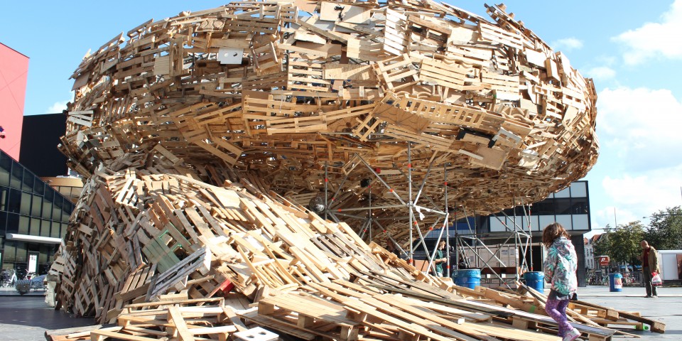 The Todays Art Festival in The Hague occurs in a critical moment in the political and cultural life of The Hague where multi-million-euro architectural projects are being approved alongside dramatic budget cuts to smaller cultural institutions. Following previous experiments, this contradiction led us to propose a structure for the festival entirely made out of discarded materials, a vortex structure expressing this idea of a natural force that sucks everything in its path. This space would serve as a meeting point/festival center on the Spuiplein, the major public square in the center of The Hague and heart of the festival.