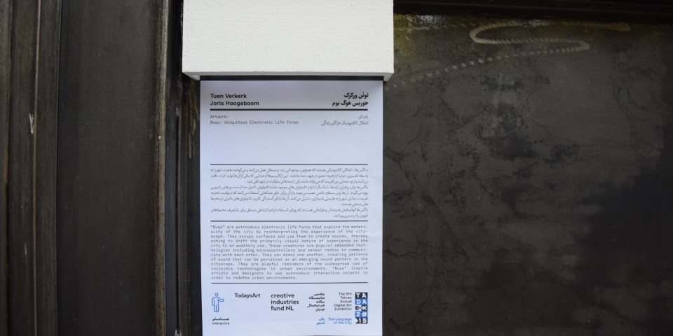 Strongly related to this year’s TADAEX topic: “the Language of the City”, the buqs were revealing the auditive qualities of the cityscape in and around Mohsen Gallery. Placing the electronic lifeforms outside the traditional gallery spaces proposed the intervention of art within the still restricted public space of Iran.