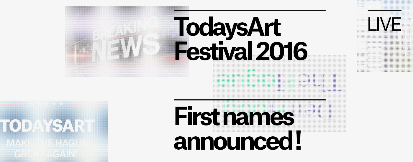 Ticket sales for TodaysArt Festival and Bright Collisions 2016 start May 30 at 12.00 (CEST) sharp. With a limited amount of early bird tickets available, we advise you all to get this tickets as soon as possible! After this there will be a variety of weekend and daypasses available. The capacity of the festival is limited, so be sure to get your ticket before you miss out! todaysart.stager.nl/web/tickets